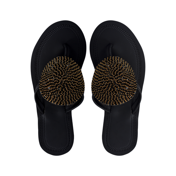 Our Black Circle Beaded Ladies Slippers, a perfect blend of simplicity and elegance. These slippers feature a minimalist design with a sleek black color and subtle golden and black beadwork in a circular pattern. The clean and stylish aesthetic makes them a versatile accessory that effortlessly elevates any outfit. Whether you're lounging at home or heading out for a casual occasion, these slippers are a must-have for the modern woman who values comfort and style.