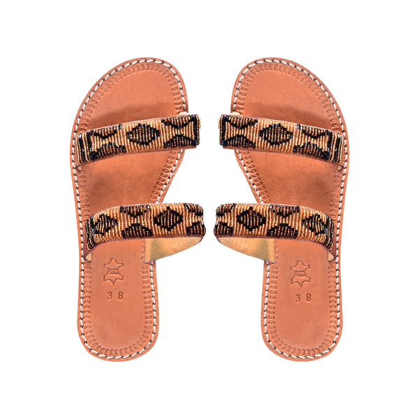 Experience the exotic beauty of African craftsmanship with our Light Brown Animal Print Beaded Open Toe Double Strap Flats for Women. These stunning flats are handcrafted by skilled artisans in Africa, reflecting their rich cultural heritage. The light brown color exudes natural elegance, perfectly complementing the minimalistic open toe design adorned with captivating animal print beads. Slip into the comfortable and breathable flats, featuring double straps for added style and stability, and experience the perfect combination of fashion and comfort.
